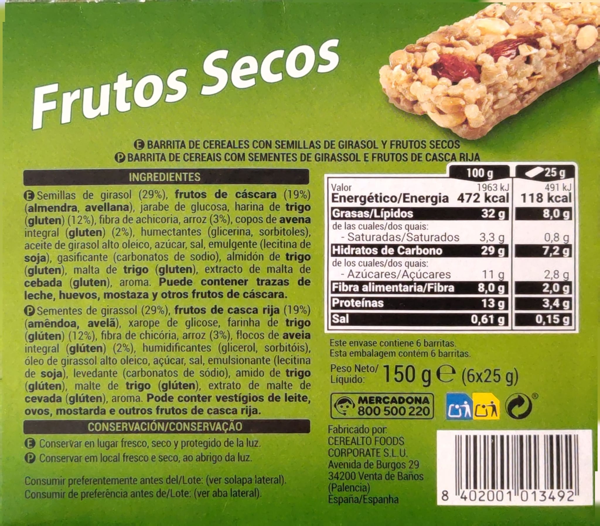 Barritas de cereales con girasol y frutos secos, de Mercadona.